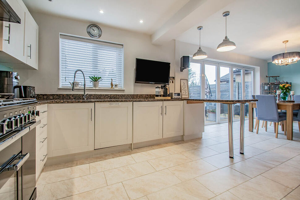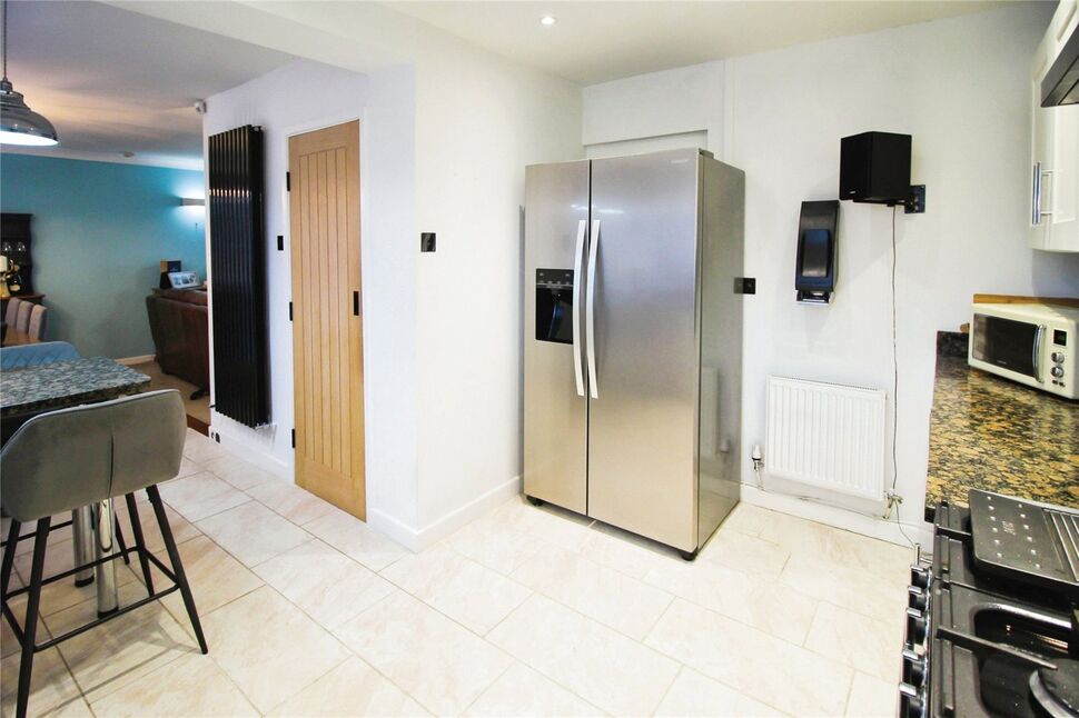 A modern range of wall and base units with a complementary work surface and breakfast bar, sink and mixer tap, space for an oven and hob, tiled flooring, feature spot down lights, integrated dishwasher, washing machine and dryer. Space for a Range style oven and hob and fridge freezer. Radiator, under stairs storage.