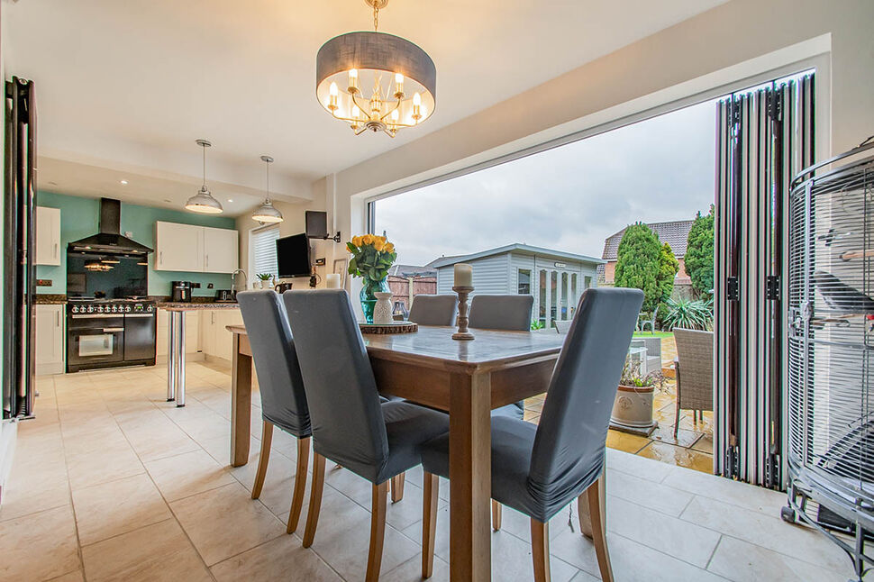 Tiled flooring, wall mounted feature radiator. uPvc double glazed Bi-Folding doors giving access to thee rear garden.