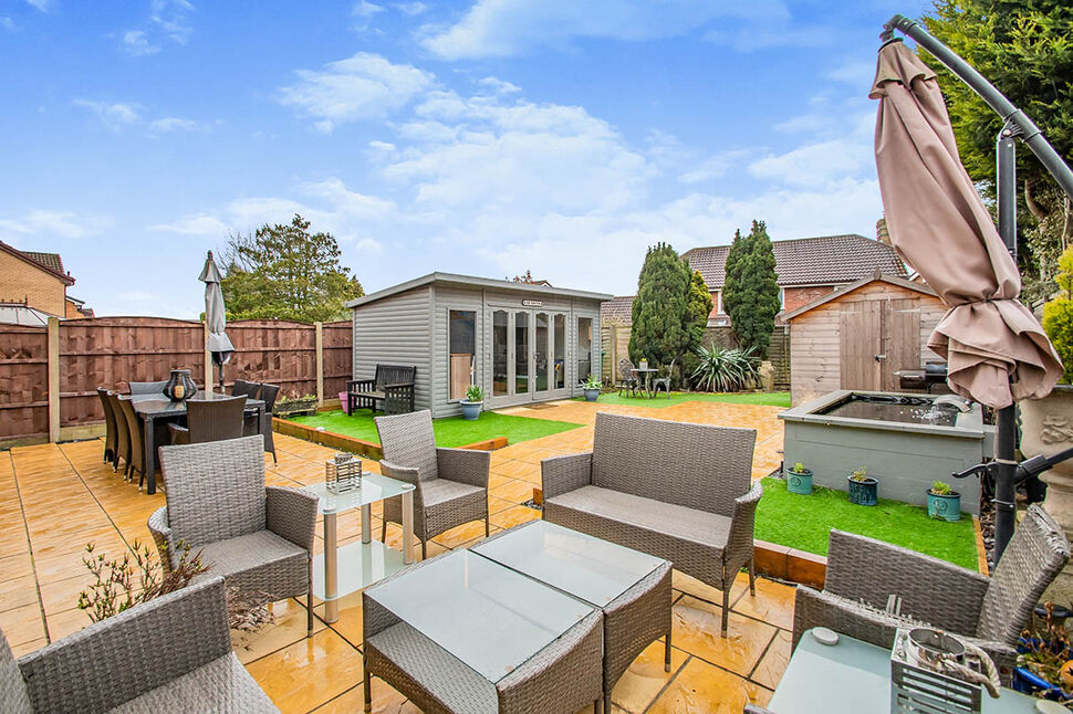 To the front of the property there is a pleasant garden with a driveway providing off road parking. To the rear of the property there is an enclosed landscaped garden with gated side access, generously sized, external power sockets, water feature, shed and a summer house currently used as a Outside Bar with power and lighting.
