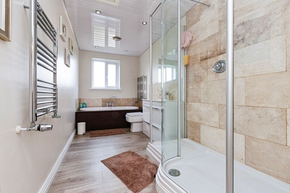 Upstairs, four generously sized double bedrooms await. The impressive principal suite features fitted wardrobes and a luxurious en-suite shower room. A modern family bathroom serves the remaining bedrooms.
