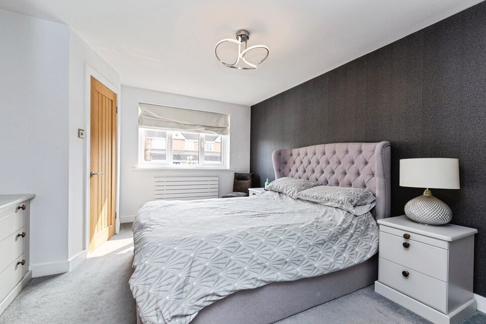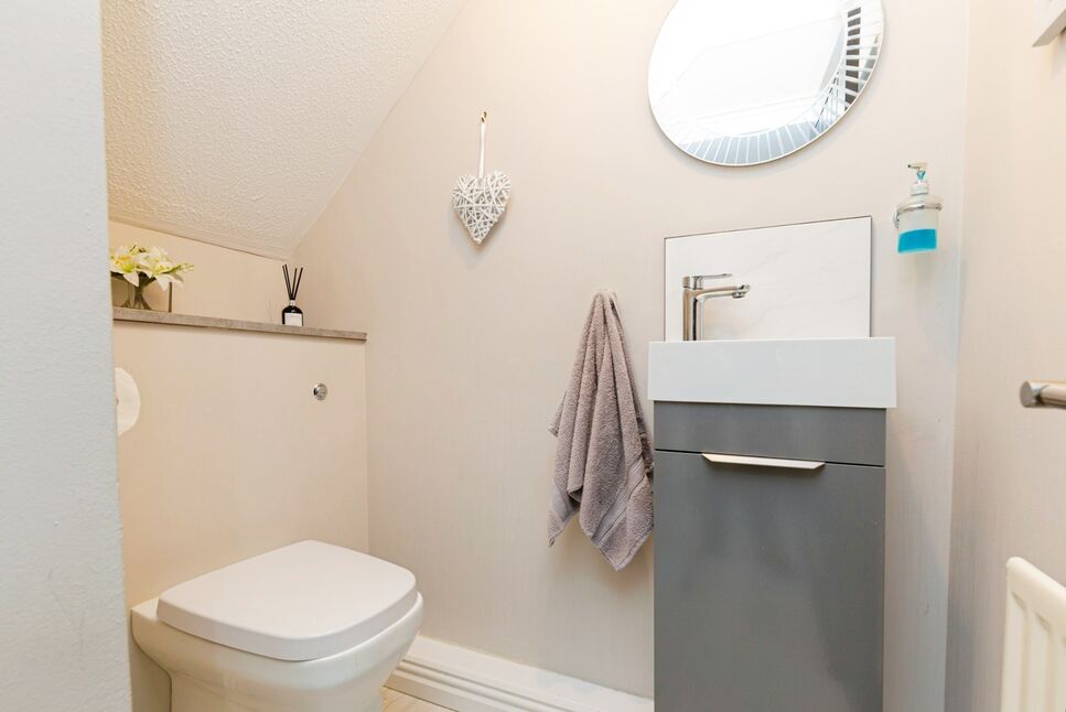 Outside, a double driveway offers parking for two vehicles and leads to an integral single garage. The enclosed rear garden is designed for both entertaining and family enjoyment, with a raised terrace perfect for al fresco dining and a lower lawned area ideal for children to play.