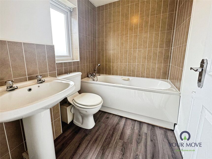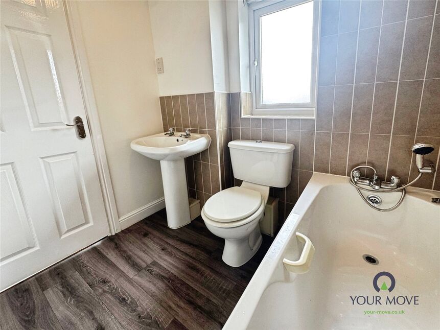 Comprising of bath, wash basin and WC in white. Partially tiled elevations, central heating radiator, uPVC double glazed window to rear aspect.