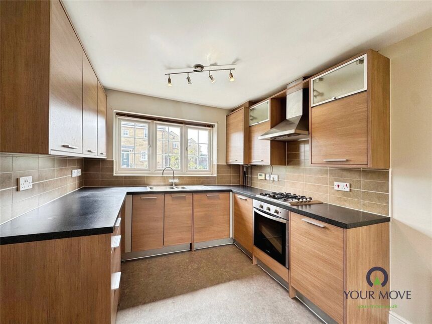 Fully fitted with a range of wall base and drawer units with contrasting work surfaces. Integrated oven with hob and extractor hood over. Sink with mixer tap over, partially tiled elevations. Central heating radiator. uVPC double glazed window to front aspect. uVPC double glazed patio door to rear aspect.