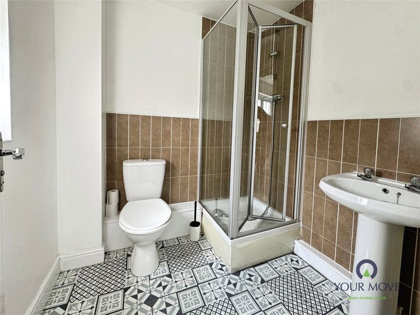 Comprising of shower cubicle, wash basin and WC in white. Partially tiled elevations, central heating radiator, uPVC double glazed window to front aspect.