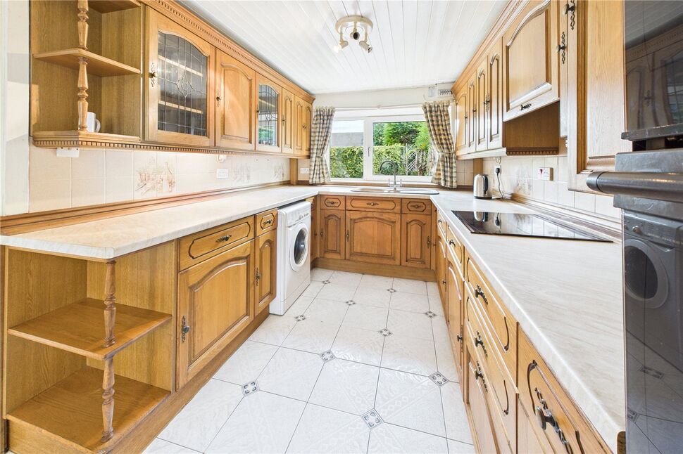 PVCu double glazed windows to front and rear, matching oak base and wall units, rolled edge work surfaces, one and a half bowl sink unit, tiled splashbacks, plumbed for washing machine, electric double oven and hob, extractor hood, single radiator, tiled floor.