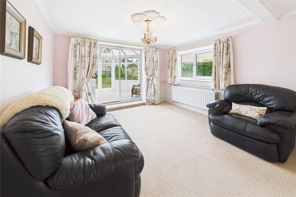 PVCu double glazed patio doors and window to front, log burner, coved ceiling, double radiator, door and return stairs to first floor landing, walk in under stairs cupboard, double glazed patio doors to conservatory.
