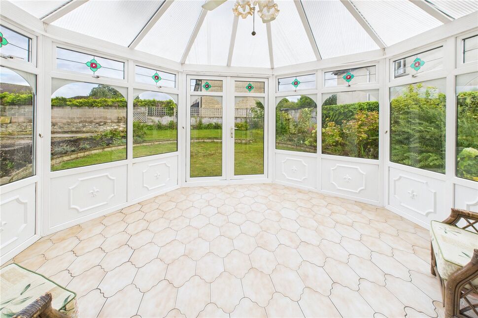 PVCu double glazing to three aspects, PVCu double glazed French doors to side, tiled floor.