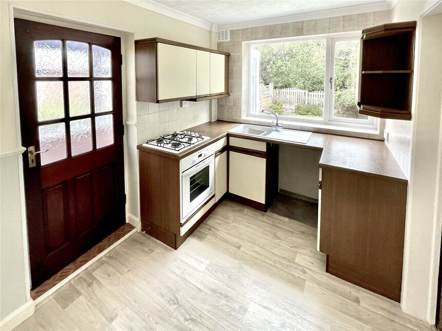 Fitted with a range of wall and base units with worktop space. Built into the units are a gas cooking hob, electric oven and sink set beneath a rear facing window. A side entrance door opens into the conservatory.