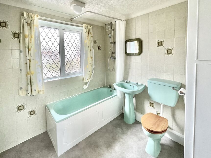 A house bathroom fitted with a coloured suite comprising: side panel bath with shower above, pedestal wash basin and a low flush wc. There is a front facing window, built-in cupboard and tiling to the walls.