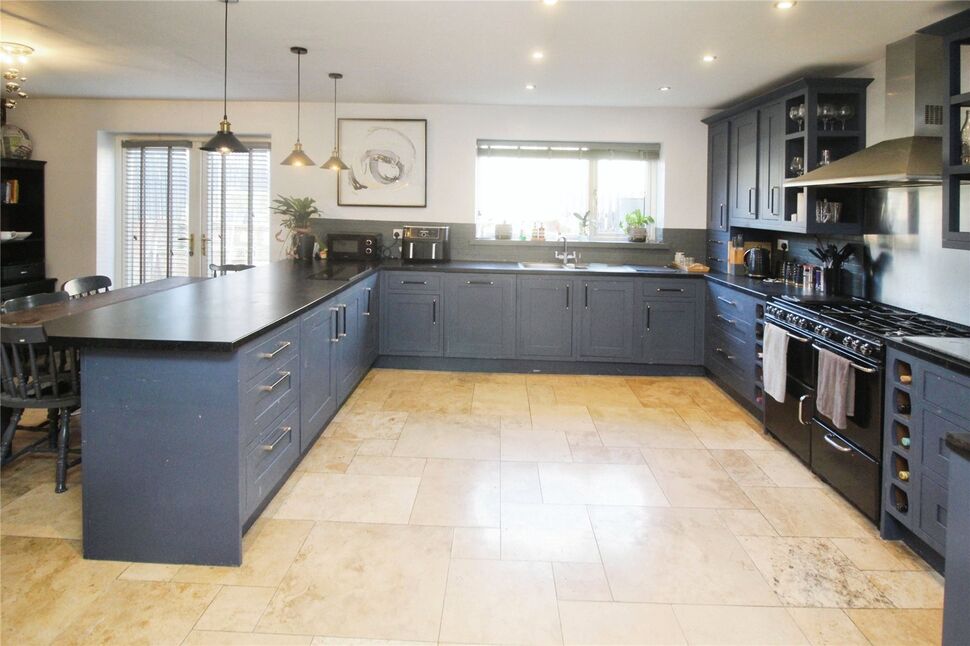 Simply wow. A superb entertaining party place, with a vast array of cupboard and draws, standing pride of place the rangemaster style oven. Built in appliances with a matching breakfast bar. Double glazed French doors opening onto the rear patio area.
