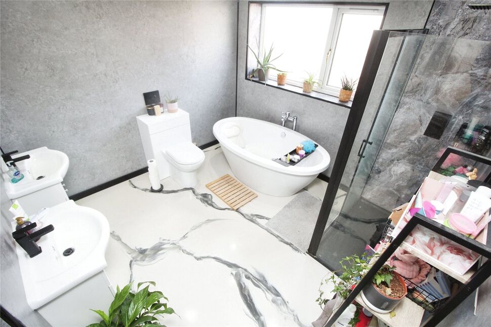 Modern beautiful, white four piece suite, servicing bedrooms four and five. With a tiled floor and two Velux windows.