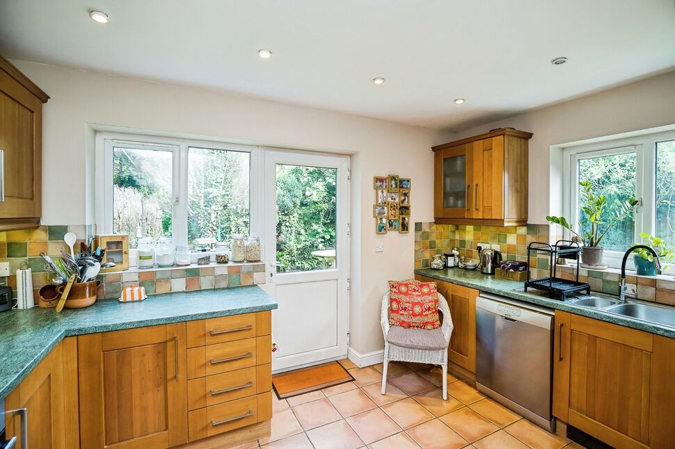 Fitted in a range of base & wall units with an engineered oak floor, comprising 1.5 bowl sink unit with mixer taps, built in AEG oven & hob, Hotpoint gas hob, extractor over, plumbing for dishwasher, double glazed window & door leading into the rear garden.