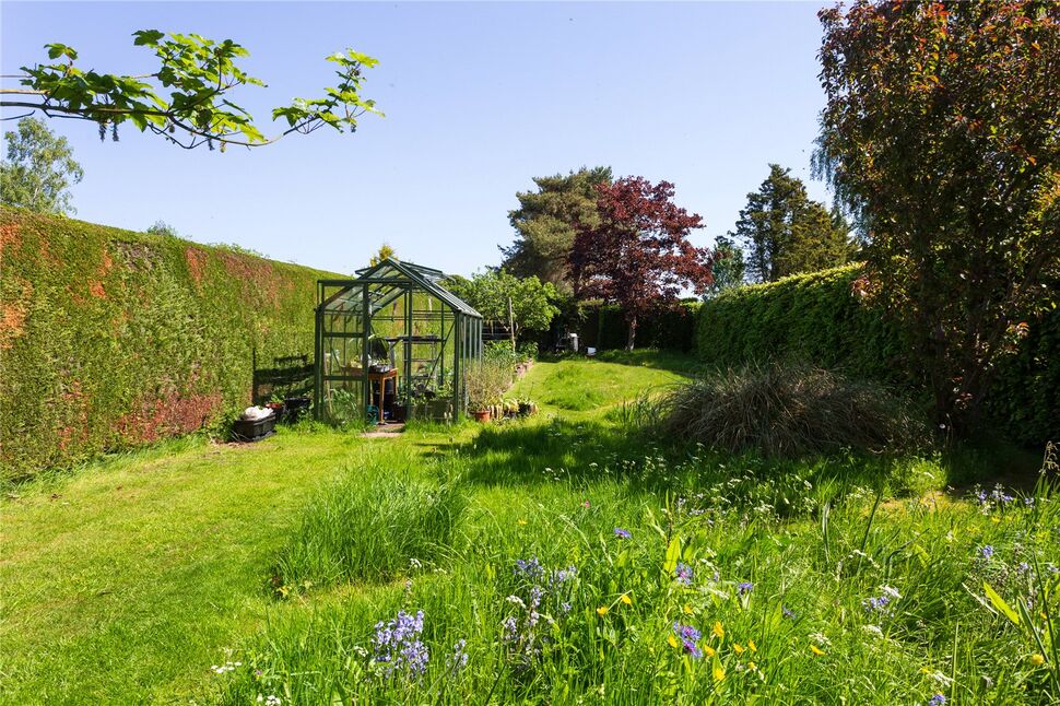 There is a mature planted garden area to the front that borders the green. A shared driveway across the green leads to a lane along the side of the house where double gates open to a block paved driveway providing off street parking and leading to the large four car garage. The delightful rear garden extends to approximately 190 ft and is mainly laid to lawn and features wild flower areas, a vegetable patch, mature trees, and hedged boundaries all overlooked by a summer house at the end.