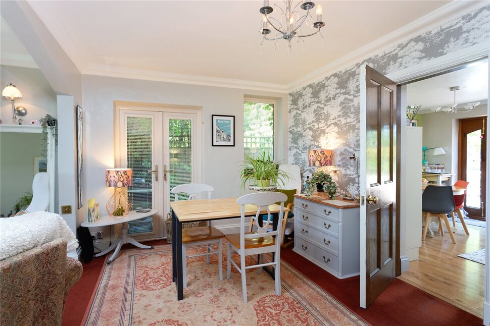 - Spacious through lounge and dining room with MORSO multi-fuel stove, square bay window, and French doors to patio.