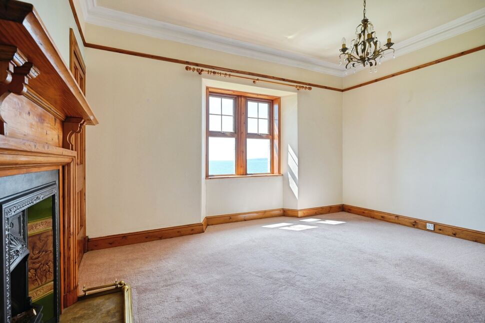Separate dining area with sea views, a feature fireplace and built-in storage.