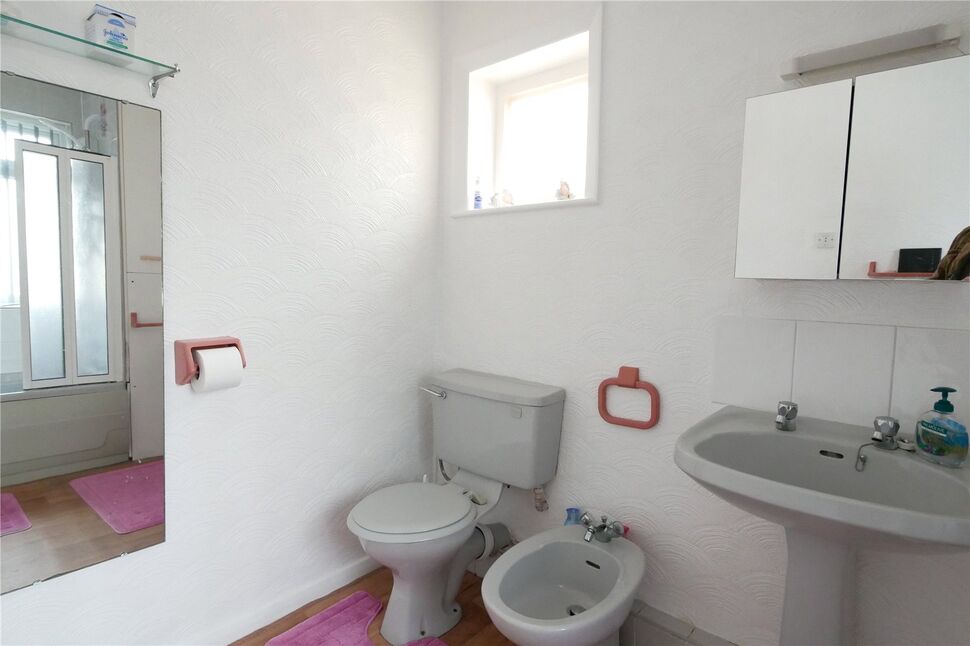 Fitted with a suite consisting of a panelled bath with Triton shower over and folding screen, a pedestal wash hand basin and W.C. There is a radiator and tiled splash backs.