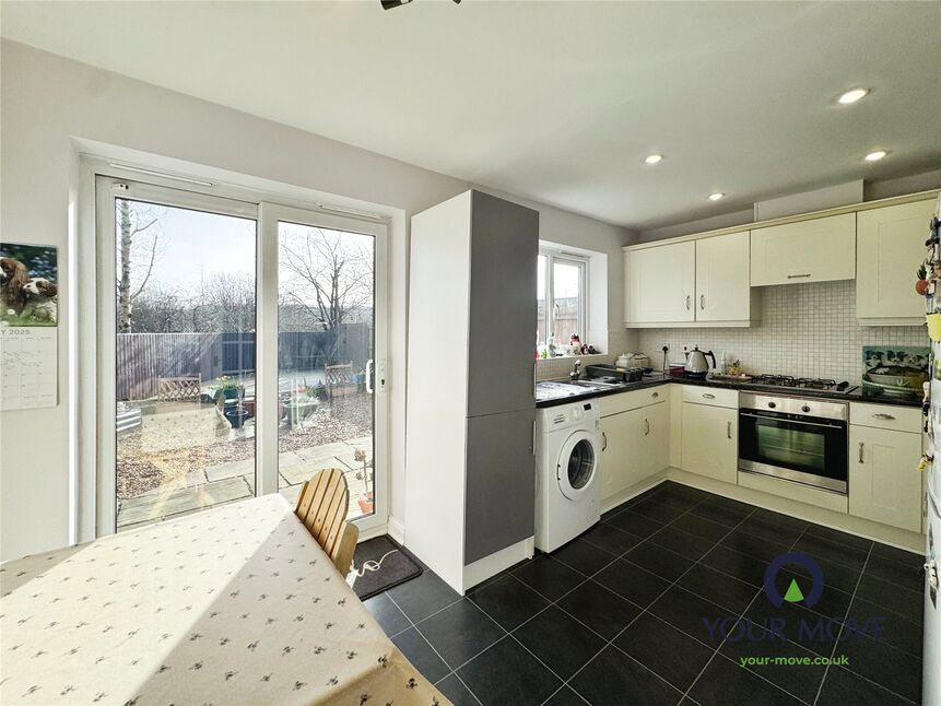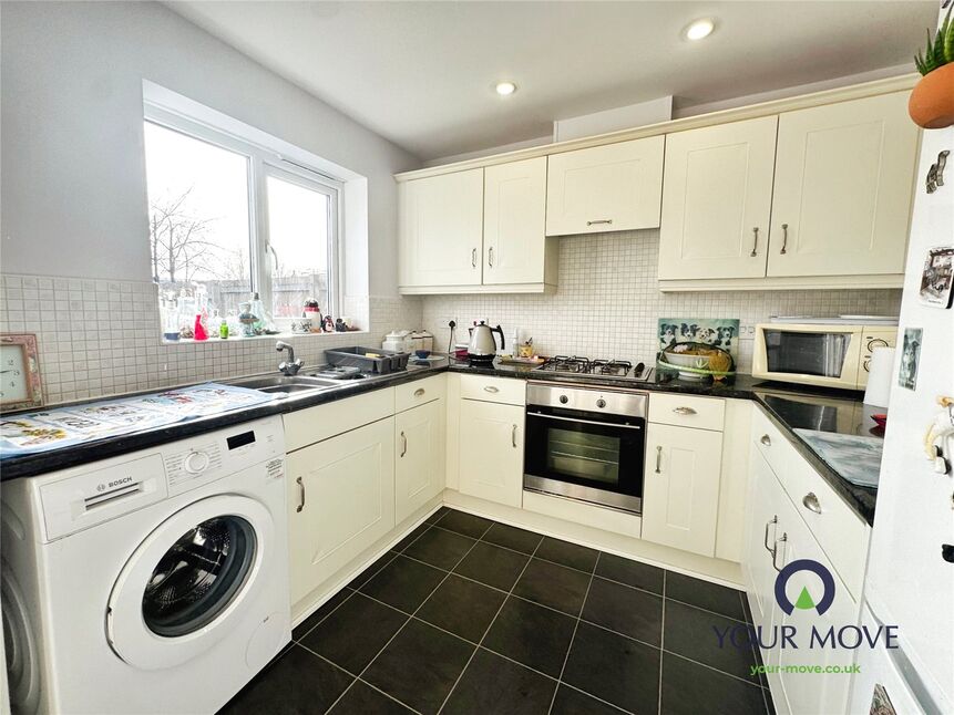 Dining kitchen fully fitted with a range of wall, base and drawer units with contrasting work surfaces. Integrated oven with hob and extractor hood over. Sink with mixer tap, space for fridge freezer, plumbed for washing machine. Central heating radiator, uPVC double glazed window to rear aspect. uPVC double glazed door to rear garden.