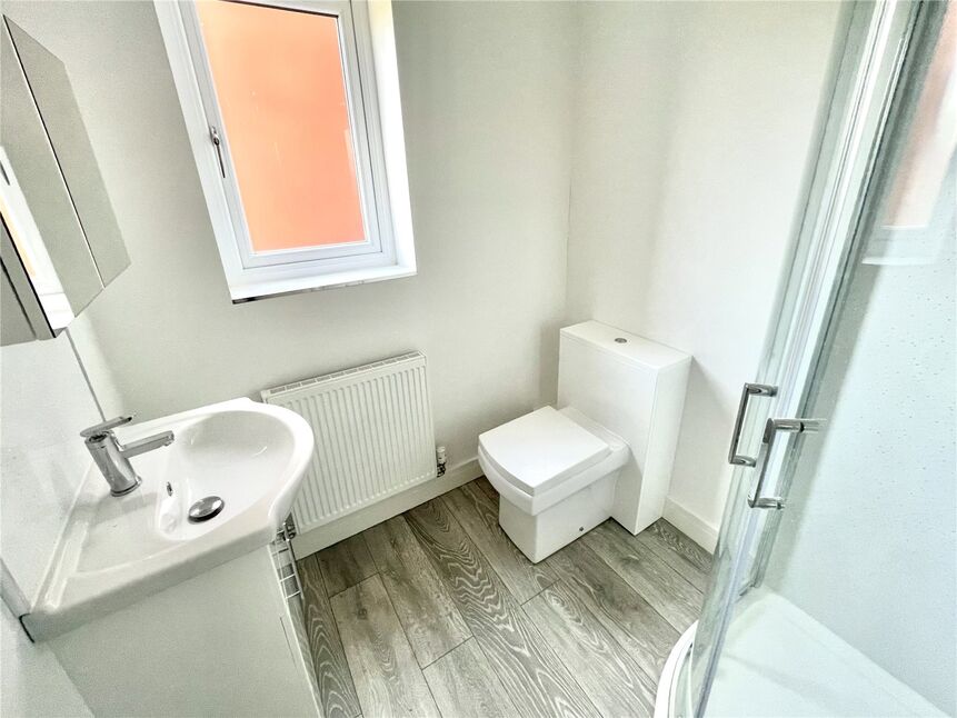 A second en-suite facility with a side facing window and comprising: corner shower cubicle, wash basin and low flush wc.