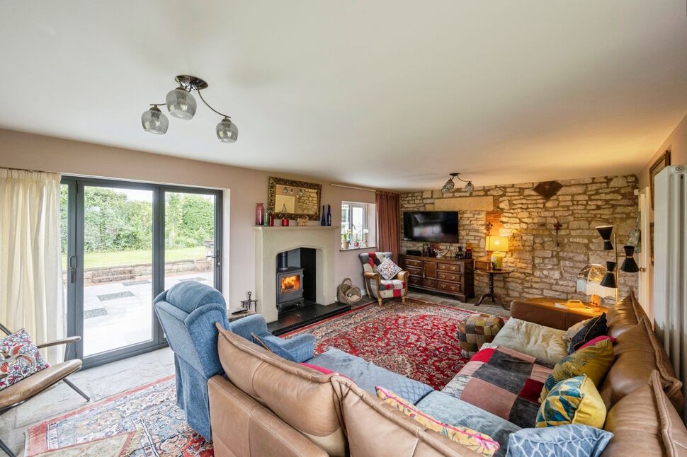 Large reception room with feature fire surround and wood burning stove, bi fold doors to the rear garden.