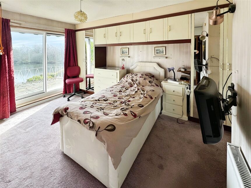 Externally, there is a small front garden with driveway providing off road parking for multiple vehicles, leading to the garage with power and electric door. At the rear is a low maintenance garden with a greenhouse which goes down to the lake at the bottom.