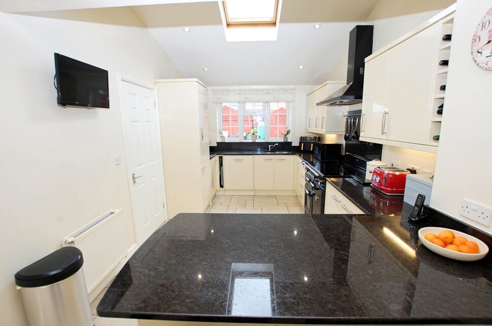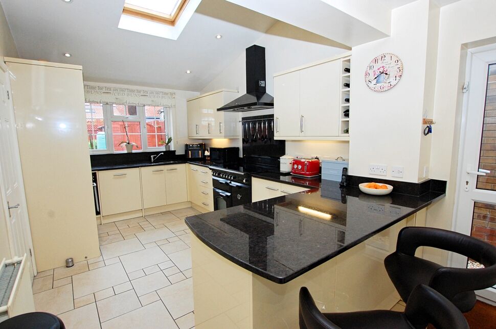 The kitchen is fitted with a modern range of base and eye level wall units with contrasting, marble work surfaces, inset sink unit, range cooker with extractor over, integrated fridge/freezer, dishwasher and washing machine. Double glazed roof light to rear, PVCu double glazed window to rear, PVCu double glazed door to the side, built in larder cupboard and a door to the wc. Tiled flooring and a breakfast bar seating area.