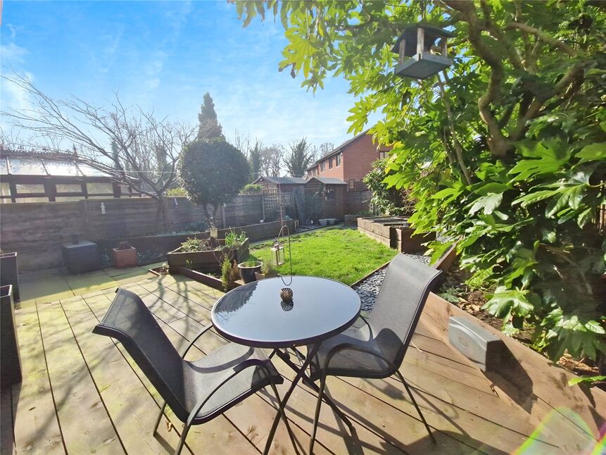Landscaped rear garden (completed summer'24) with decked and patio seating areas, lawn and flower beds.