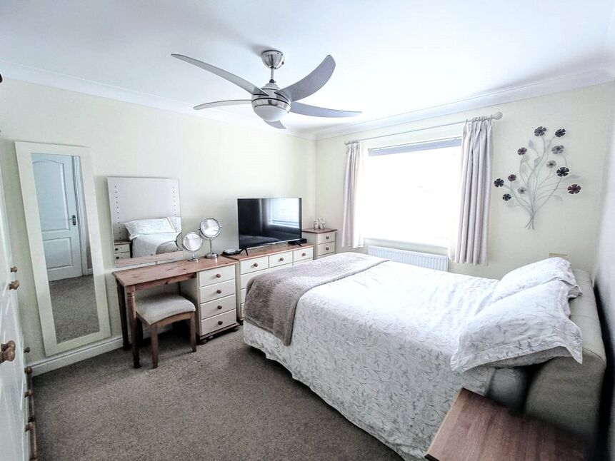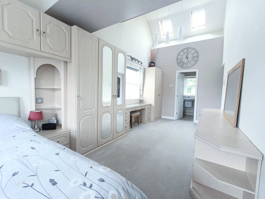 A beautiful relaxing space with full height ceiling incorporating Velux skylight windows. Fitted with a large range of fitted wardrobes, draws and matching dressing table. Having three double glazed windows to side and rear elevations.