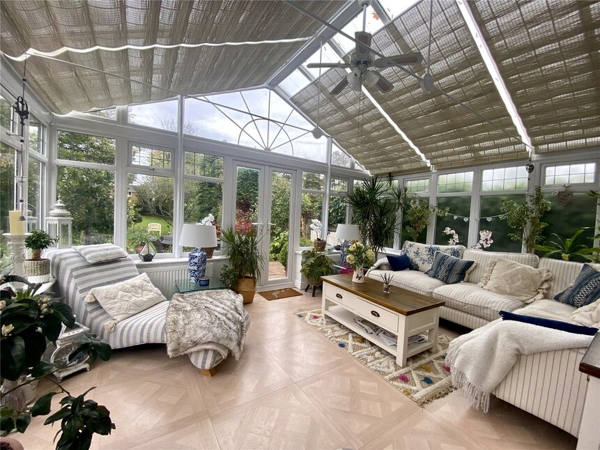A large and welcoming conservatory with multiple radiators and French doors to the rear garden.