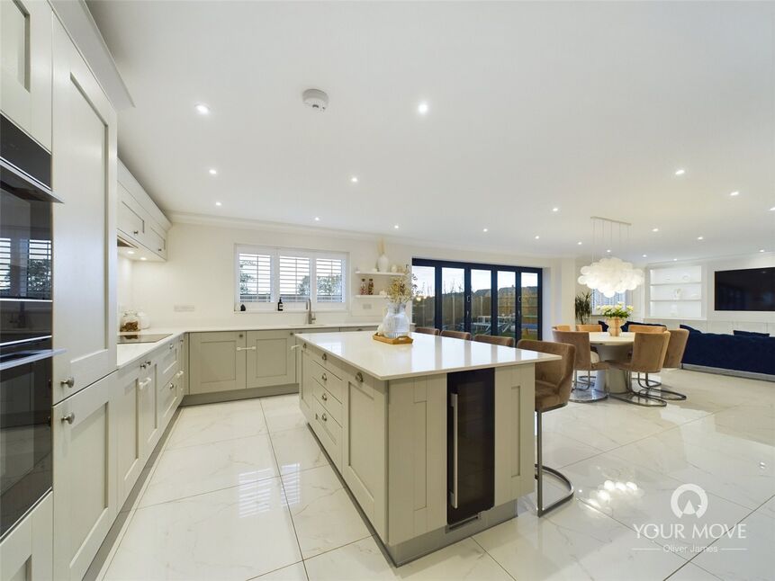 The kitchen area boasts hi quality finishes through out this "Mulberry kitchen", benefitting from integrated appliances including an integrated microwave, double oven/ grill and coffee machine set within the main bulk of the kitchen. There are wall and base units with a 1.5 bowl sink and drainer, integrated dishwasher, induction hob and cooker hood above. Integrated full height fridge and separate full height integrated freezer also. All finished off with a lovely Quartz work top. The kitchen island provides seating for four bar stools, under counter units with a wine cooler.A window to the rear aspect, along with lots of space spot lights mean that this feels like a very spacious kitchen area.