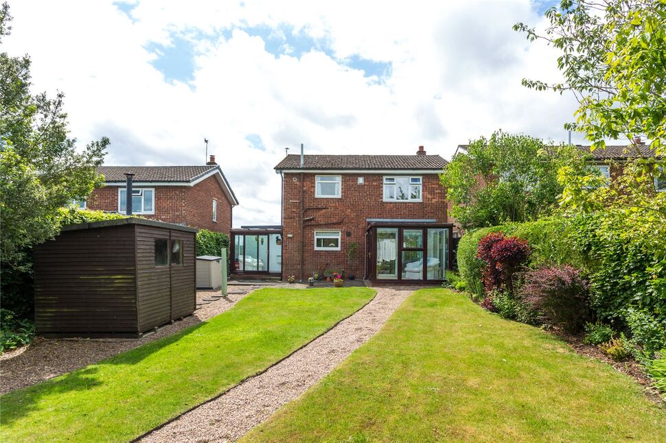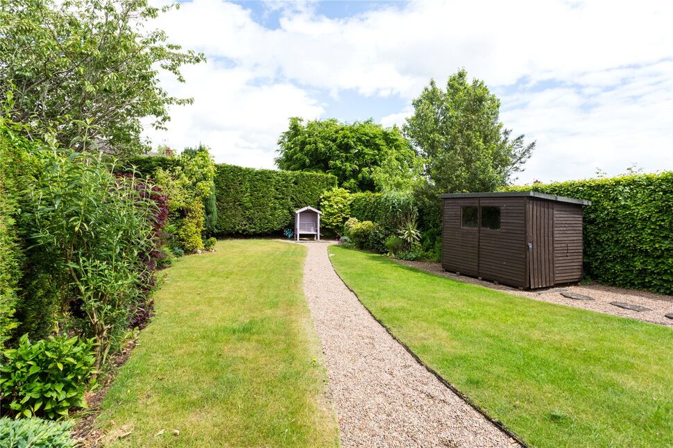 The house is set back behind a deep lawned front garden with a driveway providing off street parking for three cars and leading to the attached garage with power and light. The delightful lawned rear garden has neat gravelled pathways connecting two patio seating areas and a wooden shed. The garden is surrounded by mature hedges and planted borders.