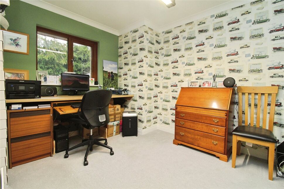A second reception room, ideal as a family room/dining room, features wood flooring and again takes advantage of the garden outlook, with direct access to the outdoor area. Its separate layout offers flexibility for entertaining or relaxation. The third reception room is currently arranged as a study, making it well-suited for those seeking a dedicated space for home working, quiet pursuits or even a fifth bedroom.