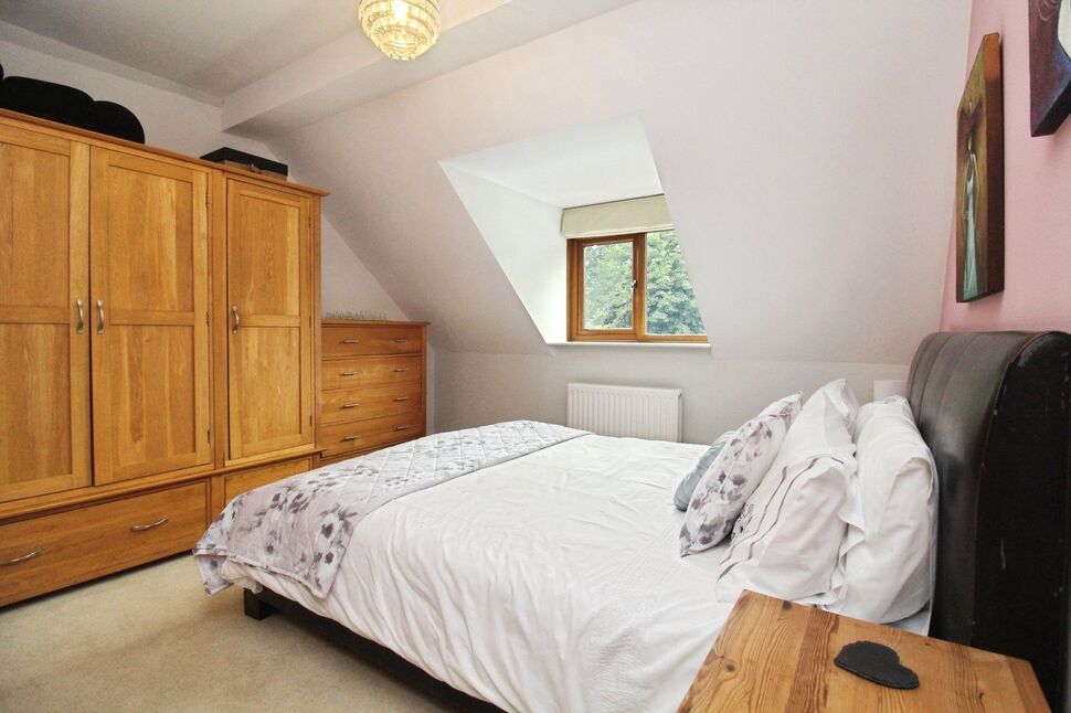 Accommodation comprises four double bedrooms, each enjoying a garden view and ample natural light. The spacious master bedroom provides a serene retreat, complete with built-in wardrobes and an en-suite bathroom fitted with a modern walk-in shower and a Velux window for additional daylight. The further bedrooms are equally well-proportioned, offering flexibility for family members or guests.