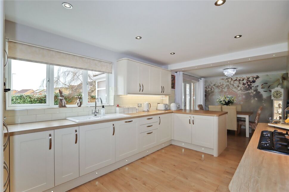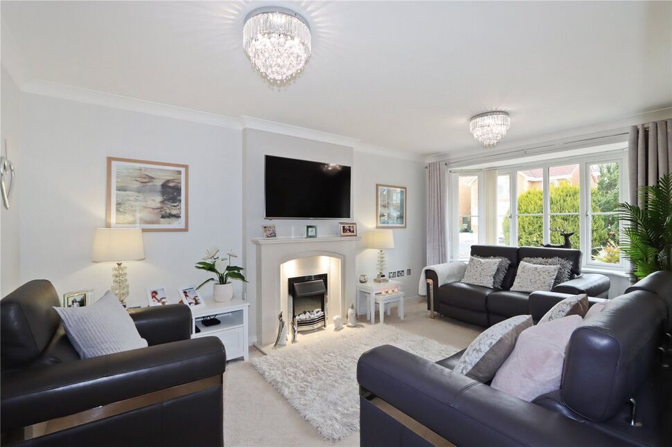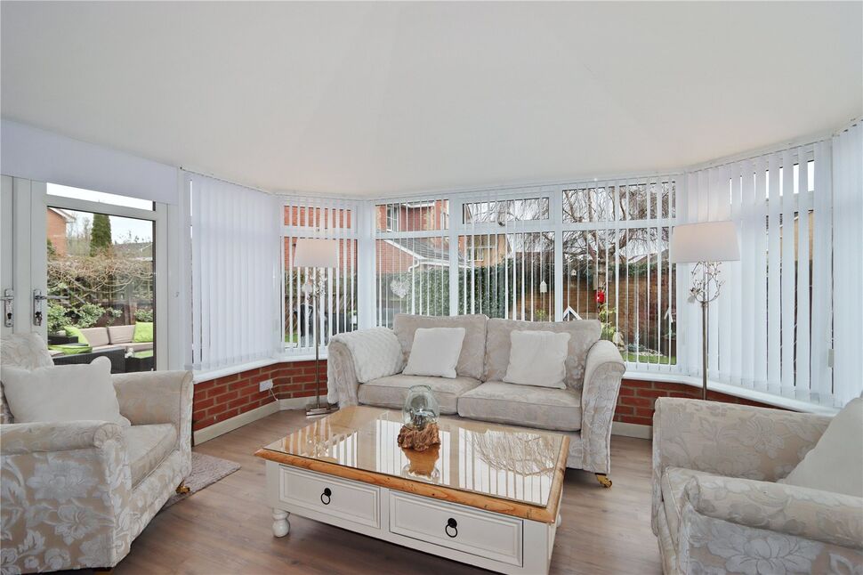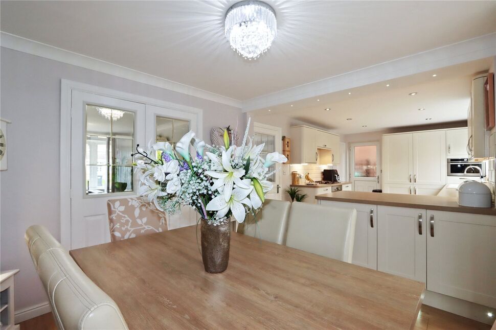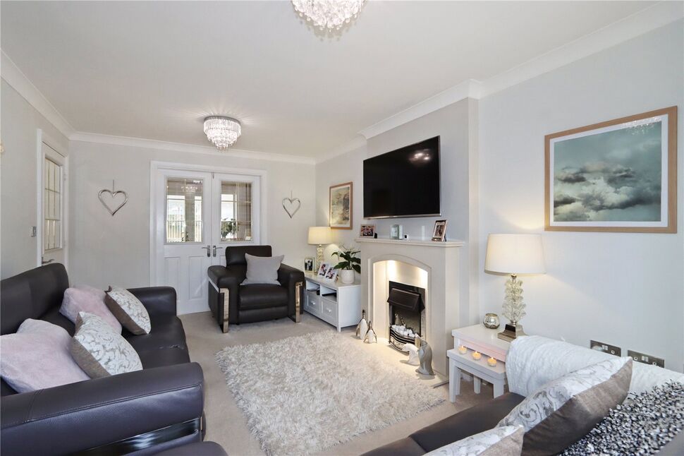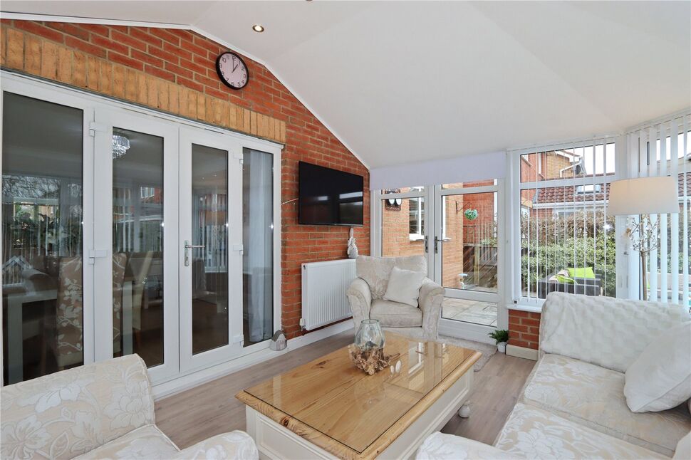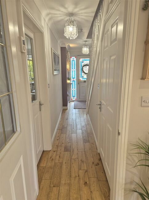 A welcoming entrance hallway with a convenient downstairs WC, leading into a spacious lounge featuring a bay window, modern electric fireplace, and double doors that open into an impressive open-plan kitchen/dining room. The kitchen is styled with timeless shaker units and includes multiple integrated appliances, while a handy utility room is located just off the kitchen for added convenience. Completing the ground floor is a bright and airy sunroom, perfectly positioned to enjoy views of the south-facing rear garden.