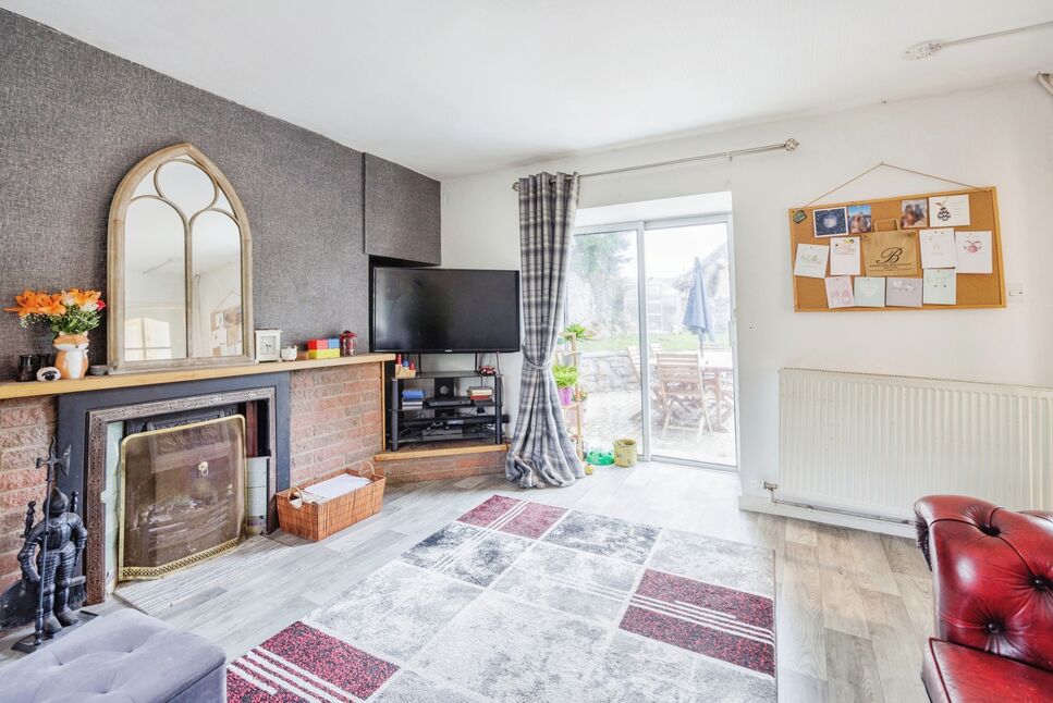 Spacious main reception room with feature fireplace. The twin aspect affords the room an abundance of natural light with patio doors connecting to the gardens.