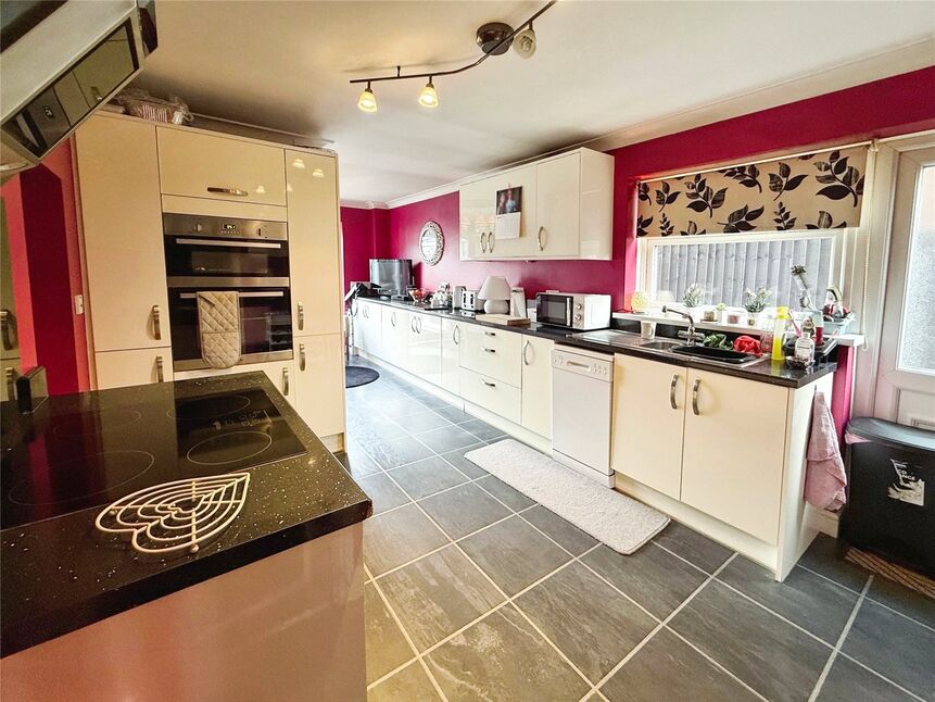 Spacious kitchen-diner comprising a range of wall and base units with contrasting roll edge work surfaces, sink and drainer unit, integral double oven, integral four ring electric hob with an extractor hood, open under stairs pantry space, space and plumbing for a dishwasher, generous dining space, uPVC door to the side aspect, double glazed window to the side aspect, tiled flooring, two radiators and uPVC double glazed sliding doors to the rear aspect.