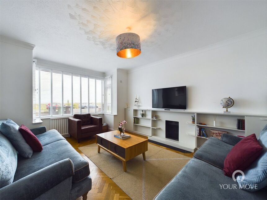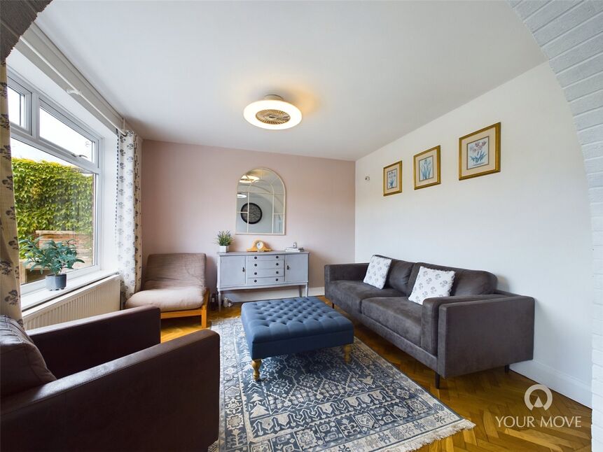 UPVC double glazed walk in bay window to front aspect, fireplace with wooden mantel, shelving and hearth, parquet flooring, radiator and coved ceiling.