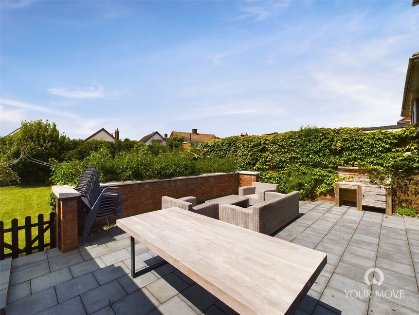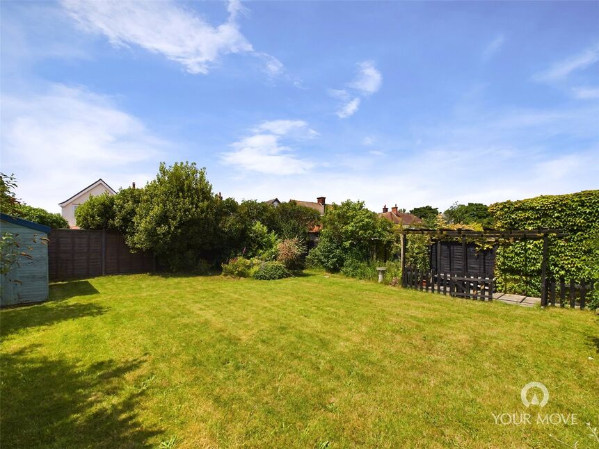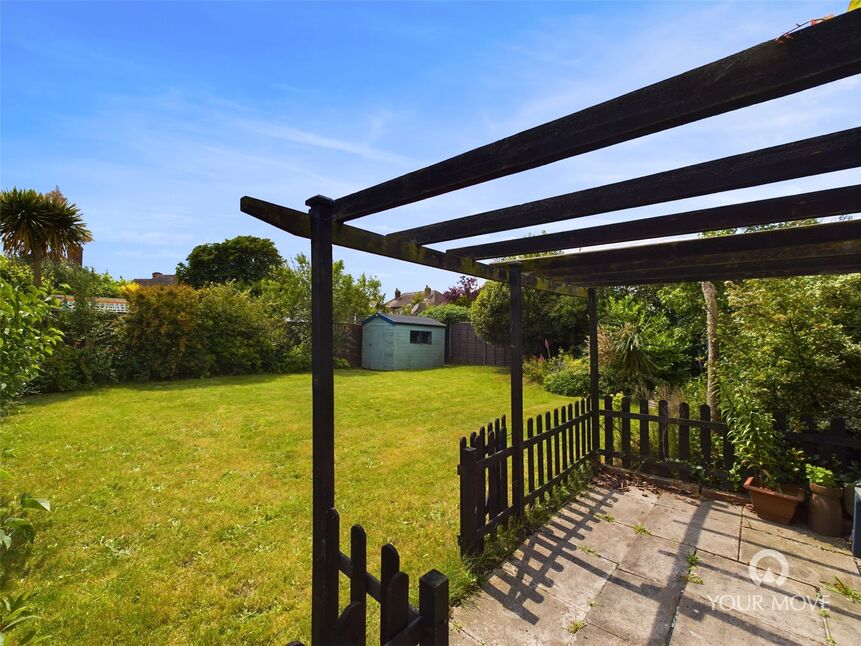 To Front:Mainly concrete driveway, leading to garage, door to wooden outbuilding leading to rear garden and brick wall surround.To Rear:Mainly laid to lawn, raised patio area, standing for shed, plants and shrubs bordered, brick wall and fencing surround.