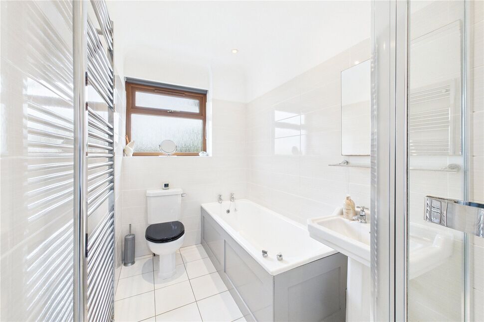 PVCu double glazed window to rear, white panelled whirlpool bath, pedestal wash hand basin, low level WC, shower cubicle, tiled splashbacks, tiled floor with electric under floor heating, towel rail radiator, extractor fan, loft access via a drop down ladder (part boarded).
