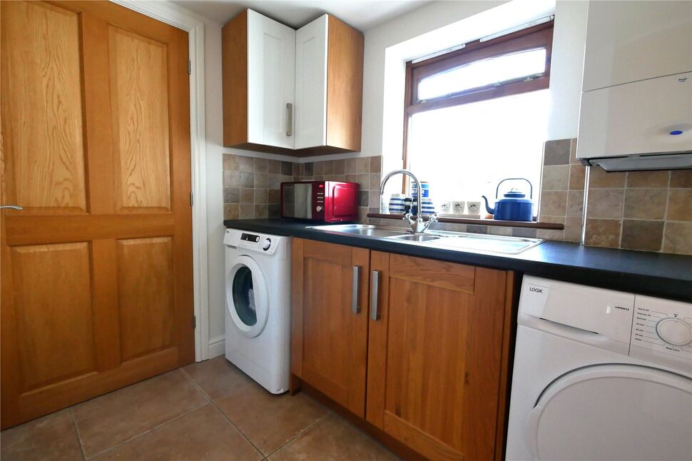 A range of oak wall and base units with black worktops, a one and a half bowl stainless steel sink and drainer with a dual control hot and cold tap, plumbing for a washing machine and space for a tumble dryer. 'Worcester' boiler, a double-glazed window to the rear, wall-mounted radiator, ceiling light and floor to ceiling storage.