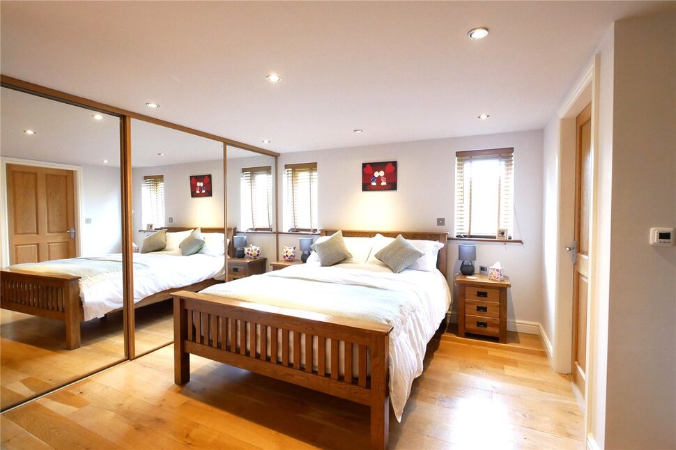 Fitted wardrobes along one wall, solid oak flooring, two double-glazed windows to the side, radiator and downlights to the ceiling.