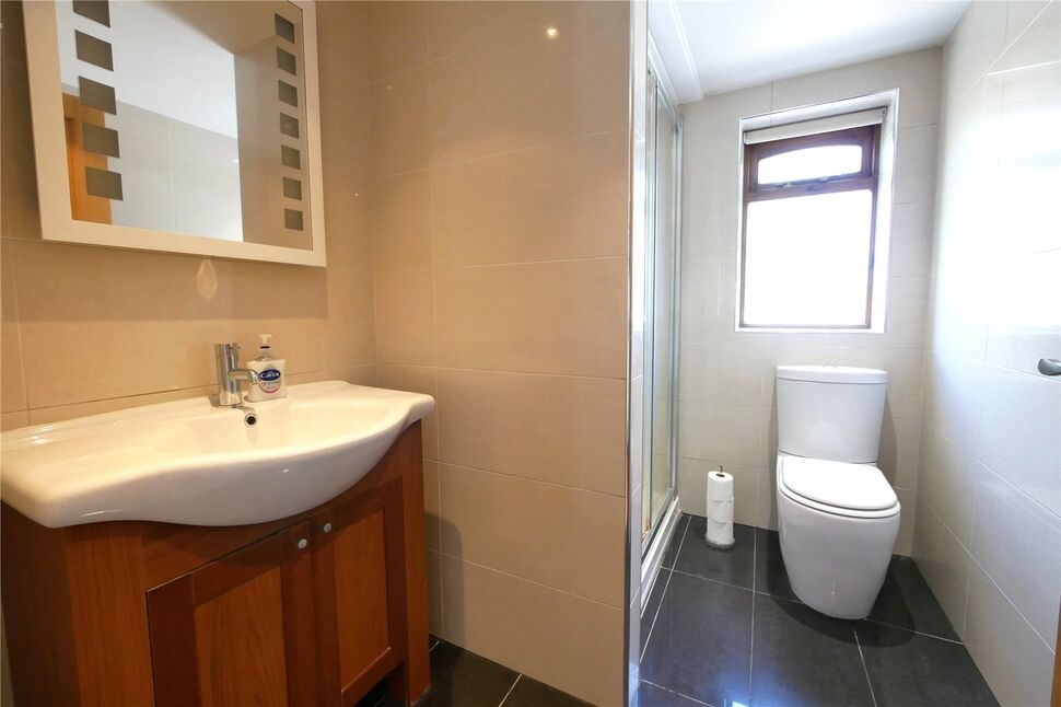 Vanity unit with a basin and a stainless steel mixer tap, WC and a step-in Mira shower with a stainless steel showerhead. Wall-mounted radiator, double-glazed window to the rear, underfloor heating and tiled flooring and walls.