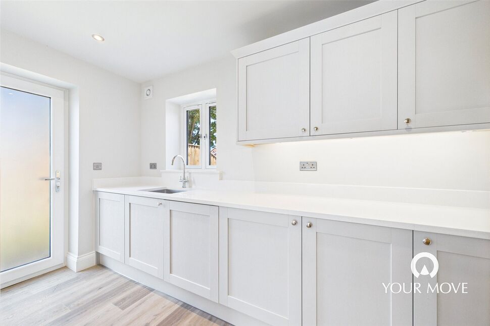 uPVC double glaze door to side entrance, uPVC double glaze window to front aspect, sink with drainer, quartz worktop and splash back, cupboards under and cupboards above, LVT wood effect flooring and spot light celling