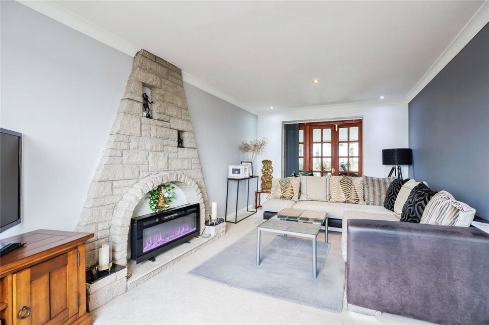 Lovely bright and spacious room enjoying a pleasant open aspect from an elevated position with feature fire place and French doors leading to the conservatory.