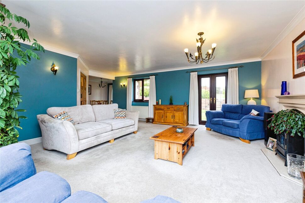 Individually designed and built, the home welcomes you through a spacious hallway providing access to all ground floor accommodation. A substantial dual-aspect living and dining room is flooded with natural light through double-glazed windows and two French-style patio doors opening onto the rear garden. A feature fireplace creates a cosy focal point, while the generous proportions and flowing shape comfortably accommodate both lounge and dining aspects.