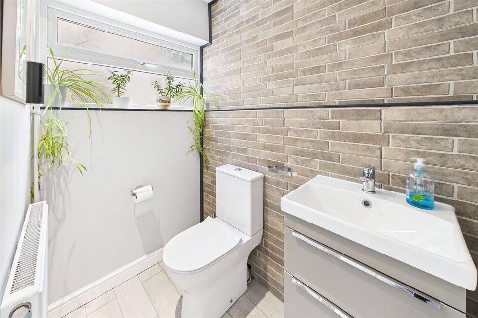 UPVC double glazed window, white low level WC, wash hand basin, vanity unit below, single radiator, tiled floor, loft access.