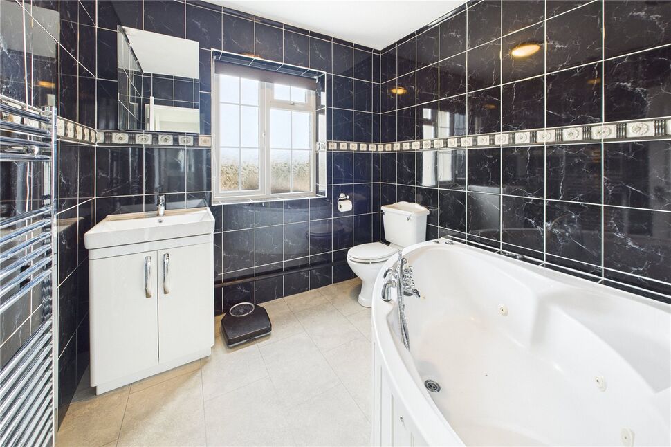 UPVC double glazed window, wash hand basin, vanity unit below, low level WC, corner whirlpool bath with overhead shower and mixer tap shower, towel rail radiator, fully tiled walls.