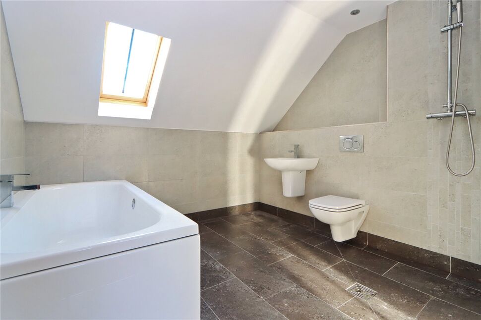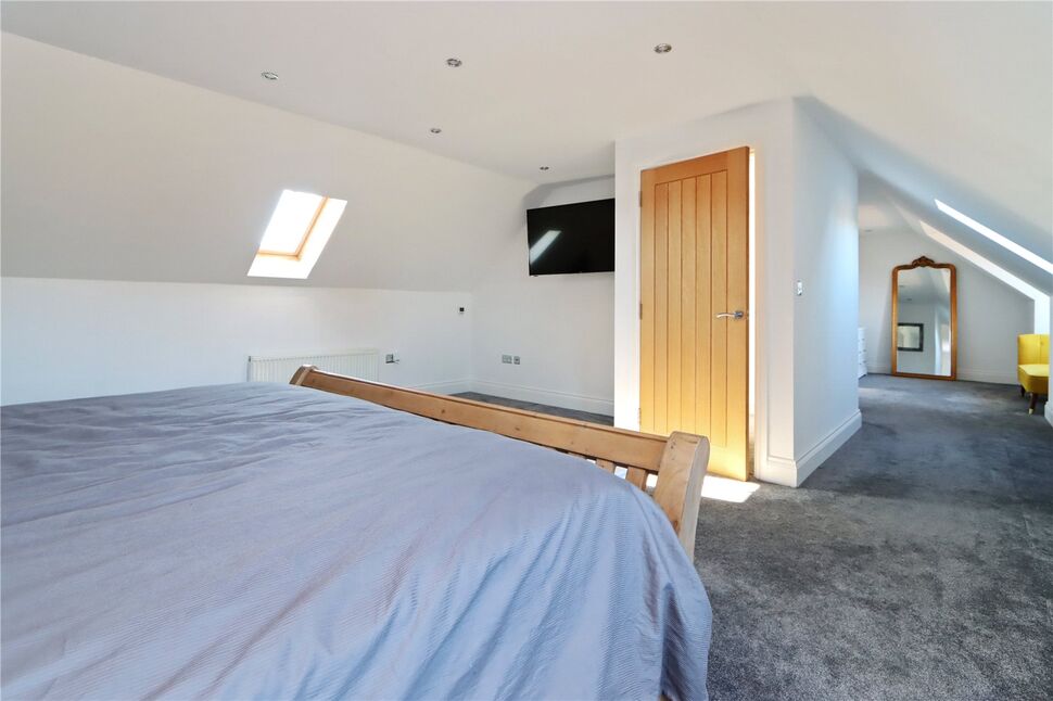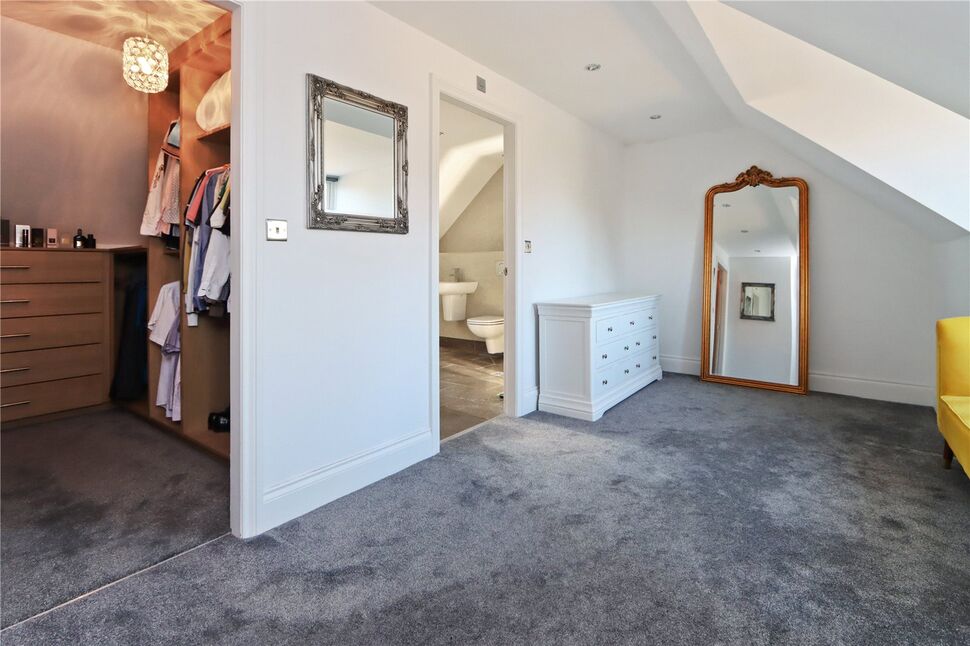 On the second floor, the luxurious principal bedroom suite spans the full width of the property, with recessed windows offering a delightful outlook. The suite includes a generous dressing area with a large walk-in wardrobe and a second en-suite wet room.