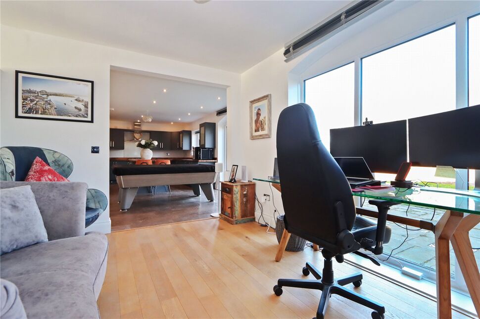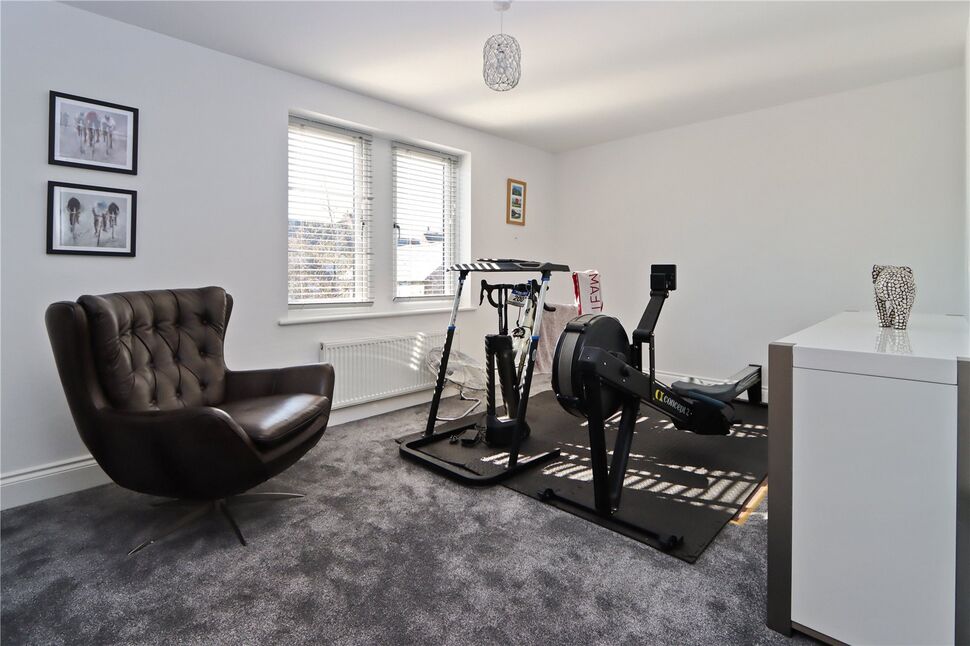 The ground floor enjoys underfloor heating throughout with independent thermostat controls. Two generously-sized reception rooms at the front of the home provide excellent living space. The living room boasts a charming feature fireplace, while the dining room benefits from a dual-aspect view. To the rear, a dining kitchen with underfloor heating is the perfect setting for family meals, with bi-folding doors opening to the enclosed rear garden. The kitchen is fitted with contemporary wall and base units topped with a complementary wooden work surface. A central island adds functionality, and a suite of integrated appliances completes the space. The kitchen seamlessly flows into a further reception room, currently used as an office. A utility room provides access to the integral garage, and a convenient W.C. completes the ground floor.