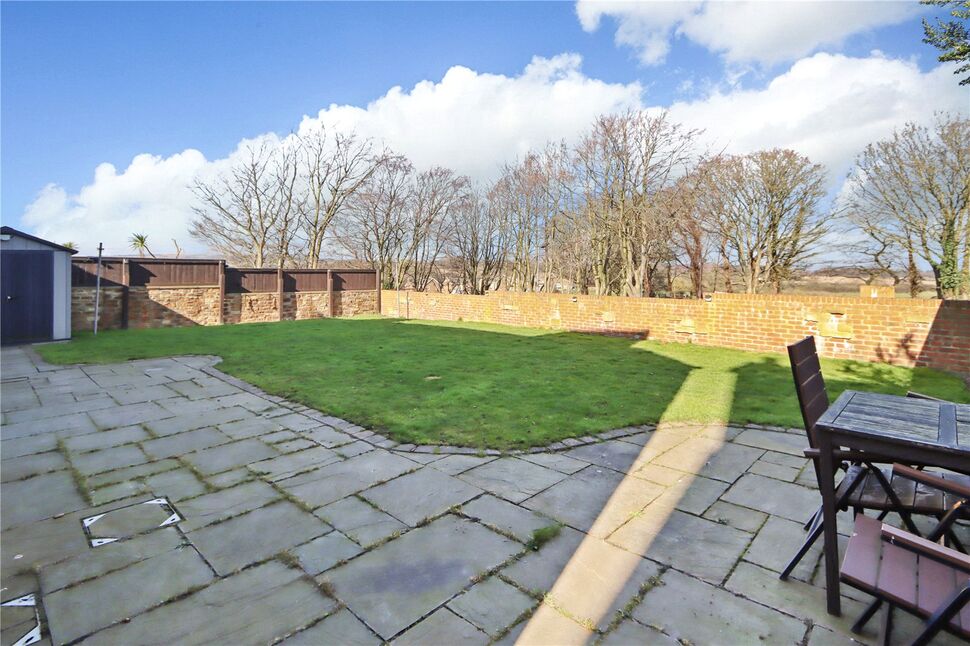 The rear garden is a beautifully level space, bordered by dry stone walls and predominantly laid to lawn. It also features patio areas ideal for outdoor entertaining.
