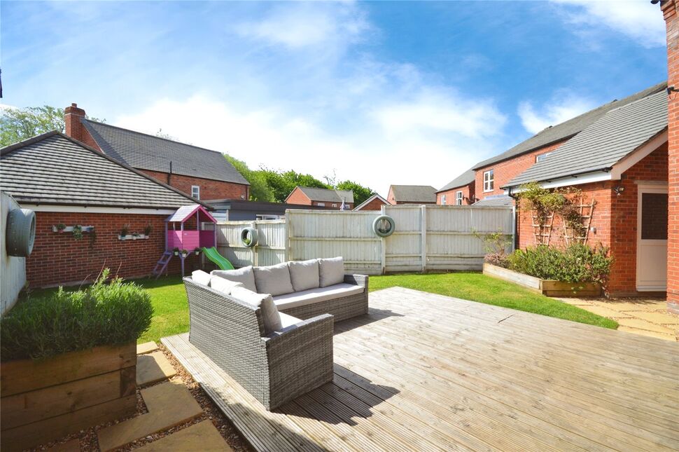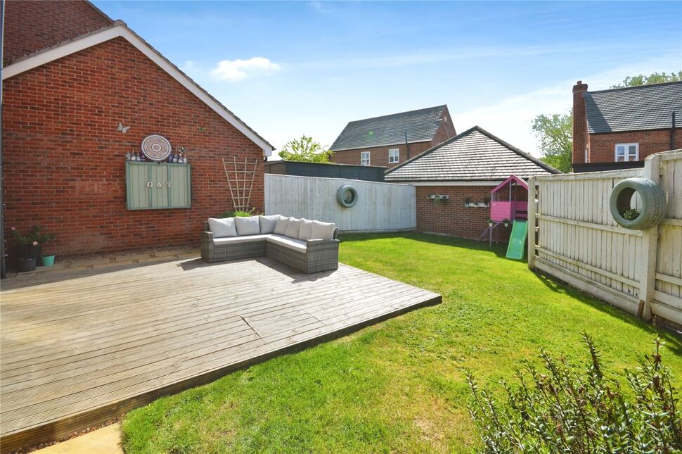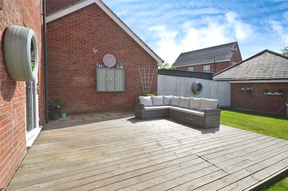 The garden is generous in size, mainly laid to lawn with a patio seating area and decking.